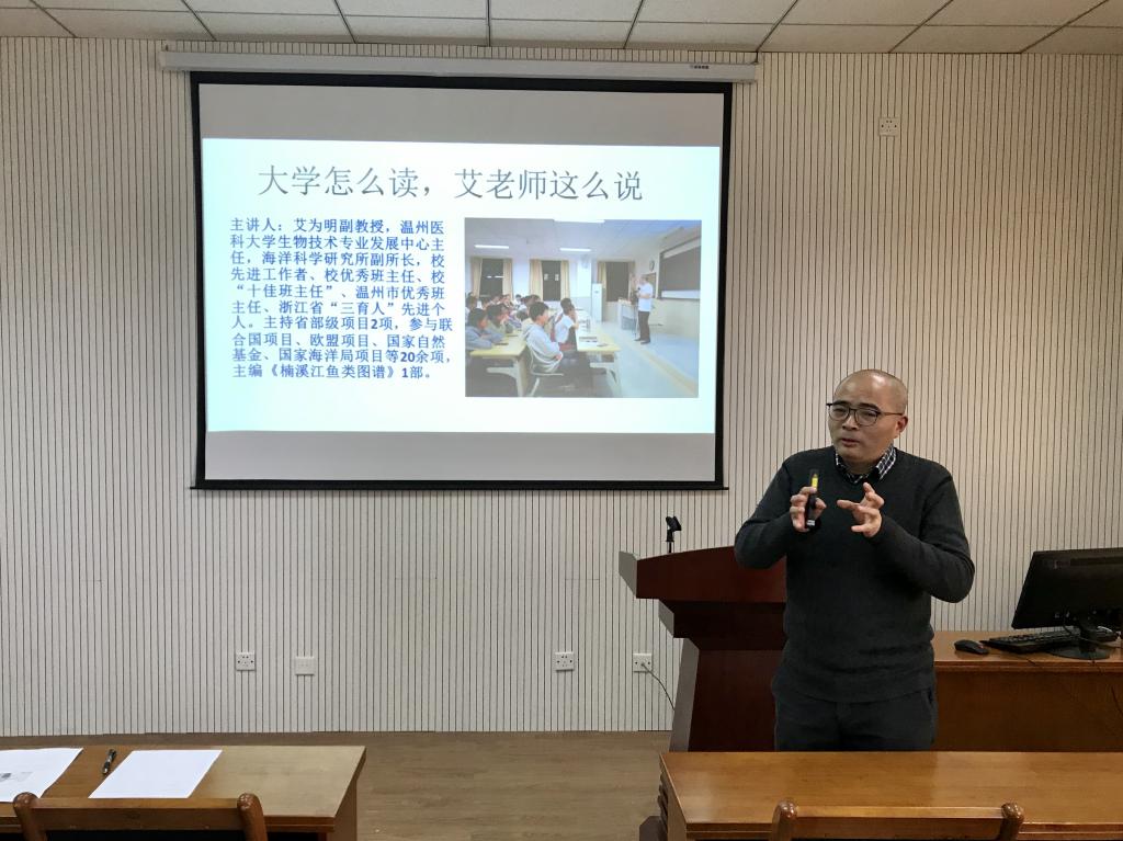 12月4日下午,温州医科大学生物技术专业发展中心主任海洋科学研究所副所长艾为明副教授来我院作题为《大学怎么读,艾老师这么说》的学术报告。