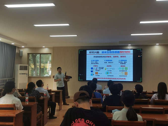 黄又举教授主讲题目为《界面超快(5s)自组装纳米粒子单层膜及其柔性生物传感应用》,他阐述了纳米金粒子以其独特的光学、电学和催化性能,广泛应用于催化、生物传感、纳米诊断、纳米医药、光谱增强和信息存储等领域。相比溶液中的独立粒子或本体块状材料,纳米金粒子的二维组装体显示了更加优越的性能和更广的应用。
