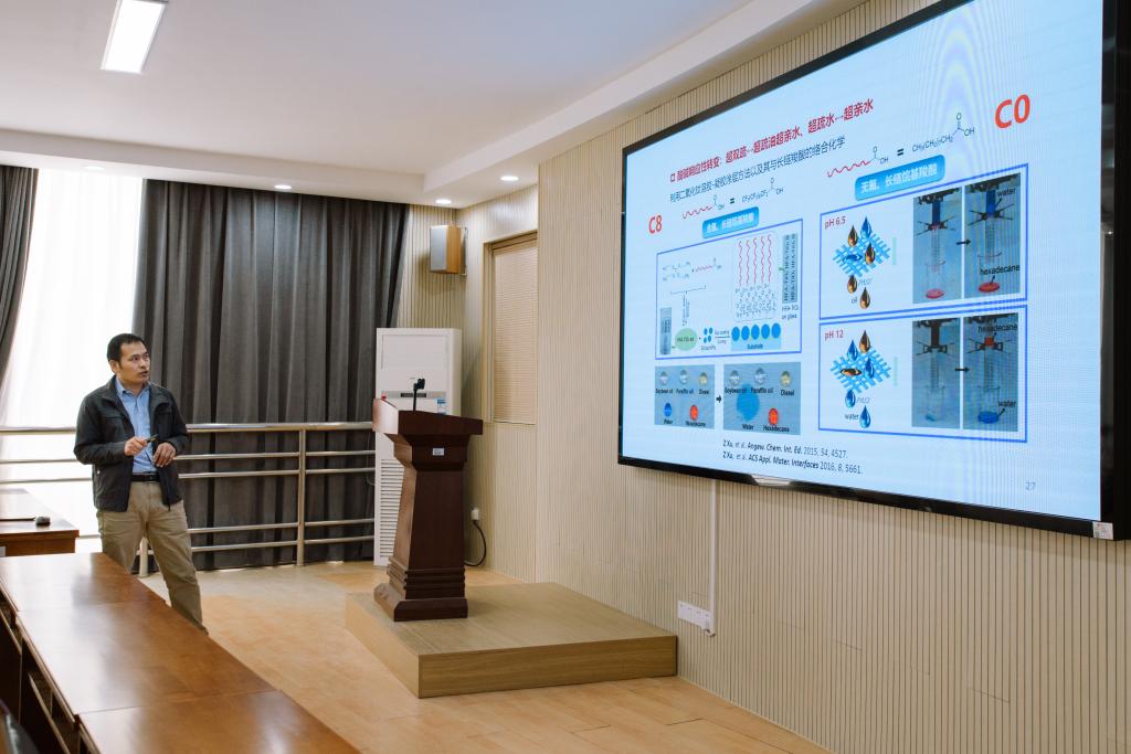本次大讲堂“名家讲坛”由中澳研究院副院长、功能高分子复合材料团队负责人徐之光教授主讲,“青年论道”分别由中澳研究院尹新星博士和苏振博士主讲。徐之光教授一直致力于材料特殊浸润性在环境保护领域的应用探究,本次主讲题目为《新型特殊浸润性材料的研究及应用》。他从材料的超双疏等性能展开,探讨无氟超疏水、无氟拒油等润湿特性,从分子结构设计入手探讨亲水-疏油、超亲水-超疏油/超疏水-超疏油双面异性等性能,强调了材料的表面特殊浸润性在我们的日常生活、工业领域等方面特殊的意义及应用。