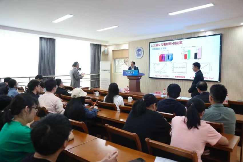 温珍海研究员首先阐释了电化学能源体系中的2个关键科学问题即电能与化学能相互转换过程中存在的阴/阳极电化学热力学性质与动力学速率不协同问题/阳极还原氧化反应各自适宜介质差异问题。围绕以上问题,温珍海研究员着重介绍了其领衔的课题组近期做的三方面工作:一是通过构建不同的电化学性质离子为阴、阳极载流子的混合电化学能源体系,协调阴/阳极电化学反应的媒介环境,提升活性物质分子电极反应的热力学活性和动力学速率,从而显著提高了相关电化学能源器件的性能;二是通过设计构建阴/阳极之间具有pH梯度的混合电化学合成体系,既优化了阴/阳极反应的介质环境,又能通过利用电化学中和降低电化学合成过程中的电耗;三是开发了以不同离子为载流子的水系电池和有机电解液电池,突破了传统电池电化学工作电压窗口限制瓶颈,显著提高了电池的工作电压和功率密度。报告结束后,在场师生踊跃提问,温珍海研究员耐心地解答了师生们提出的问题,现场气氛热烈。
