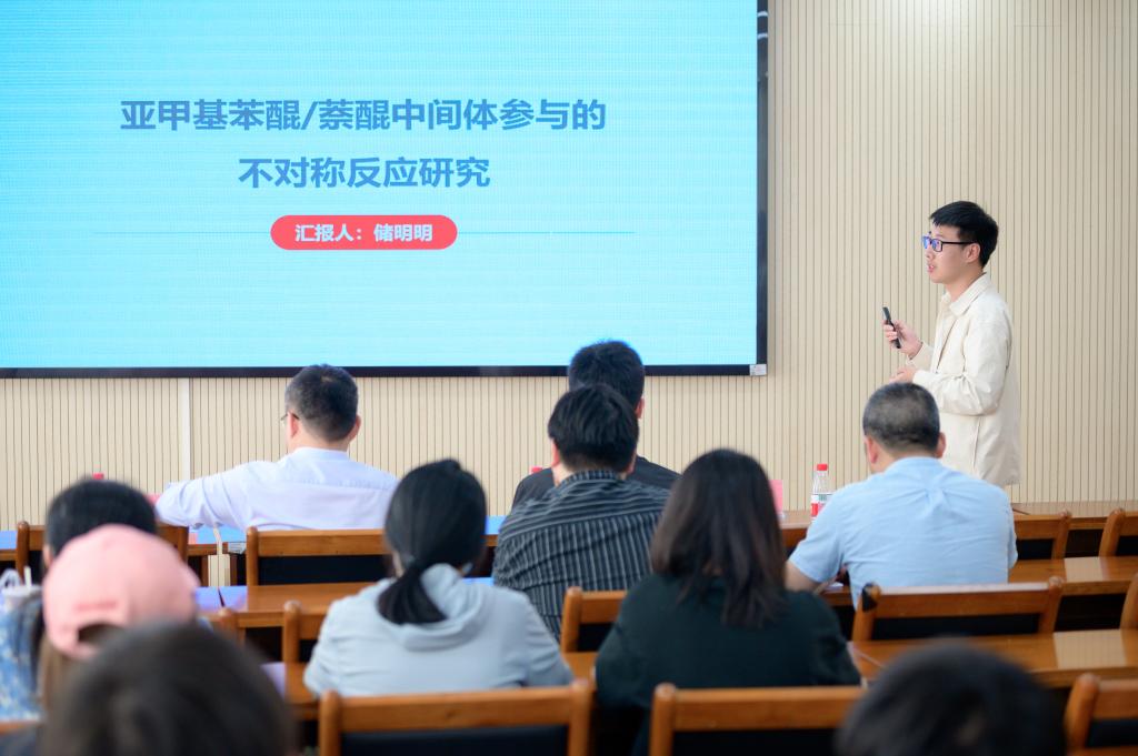 储明明博士作题为《亚甲基醌类中间体参与的不对称反应》的报告。报告认为,亚甲基醌类化合物是一类重要的反应中间体,其结构具有很强的再芳构化趋势,在化学反应中表现出较高的反应活性和巨大的合成潜力。报告人从亚甲基醌类中间体原位生成策略出发,基于不对称有机催化和不对称金属催化,设计了亚甲基醌类中间体参与的不对称共轭加成反应、[4+n]环合反应,在构建手性二芳基甲烷类及苯并氧杂环类骨架方面表现出独特的优势。