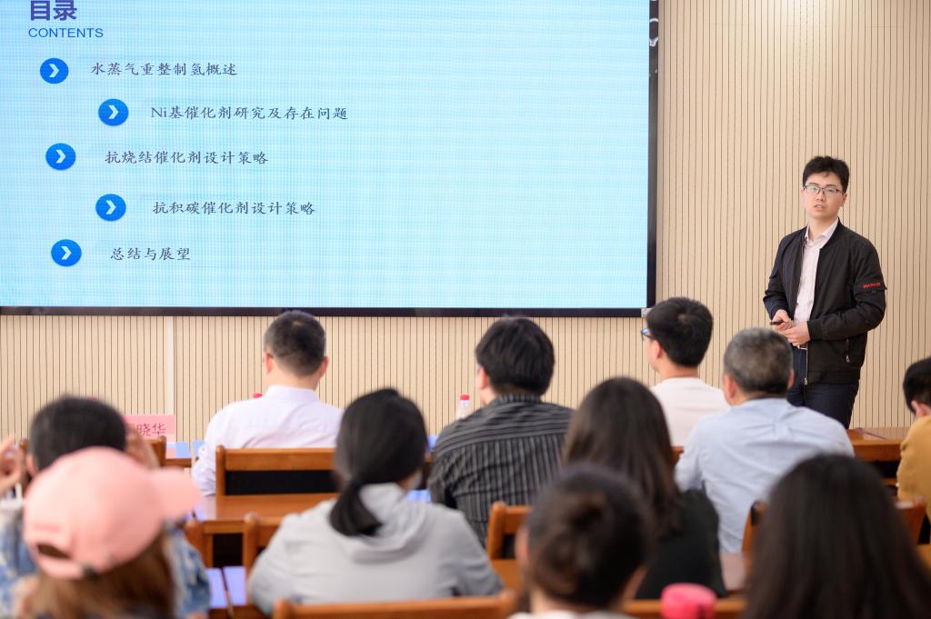 蒲江龙博士作题为《Ni基催化剂用于生物油水蒸气重整制氢》的报告。报告介绍了价格低廉的Ni基催化剂可以有效实现反应物中C-C和C-H键的断裂,但同时存在严重的烧结和积碳问题,导致催化剂失去活性。报告人从Ni基催化剂表面的反应机理出发,阐述抗烧结、抗积碳催化剂的制备和构效关系,为后续相关高温反应的催化剂设计提供思路。