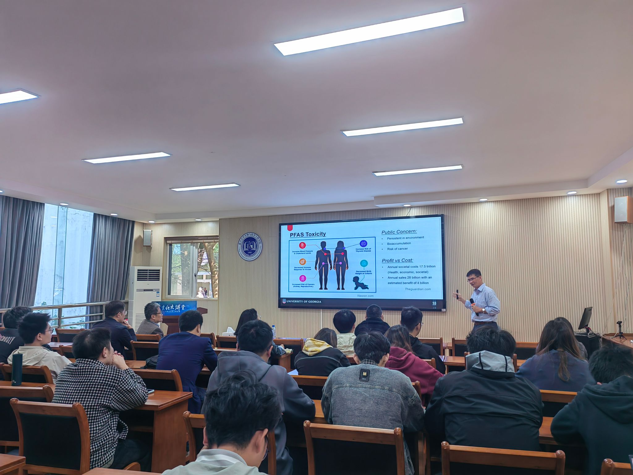 11月6日上午,美国佐治亚大学黄庆国教授作客“生化大讲堂”并应邀为生化学院师生做题为《“永生分子”PFAS:挑战、法规和机遇》的学术报告。生化学院胡长伟教授主持会议,全院师生近50人到场聆听。
