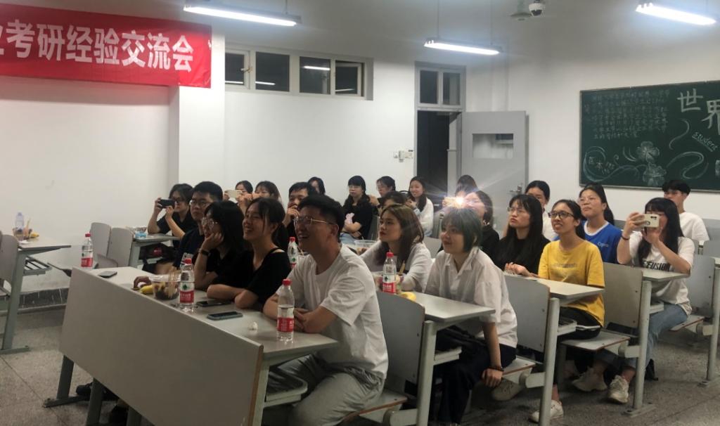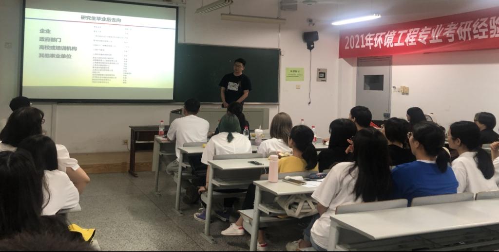 环境171班林驰浩、环境172班胡士涛、环境16级的汪密密、环境171班余青等4位同学分别就自己在院校的选择、备考、复试等方面进行了经验分享。