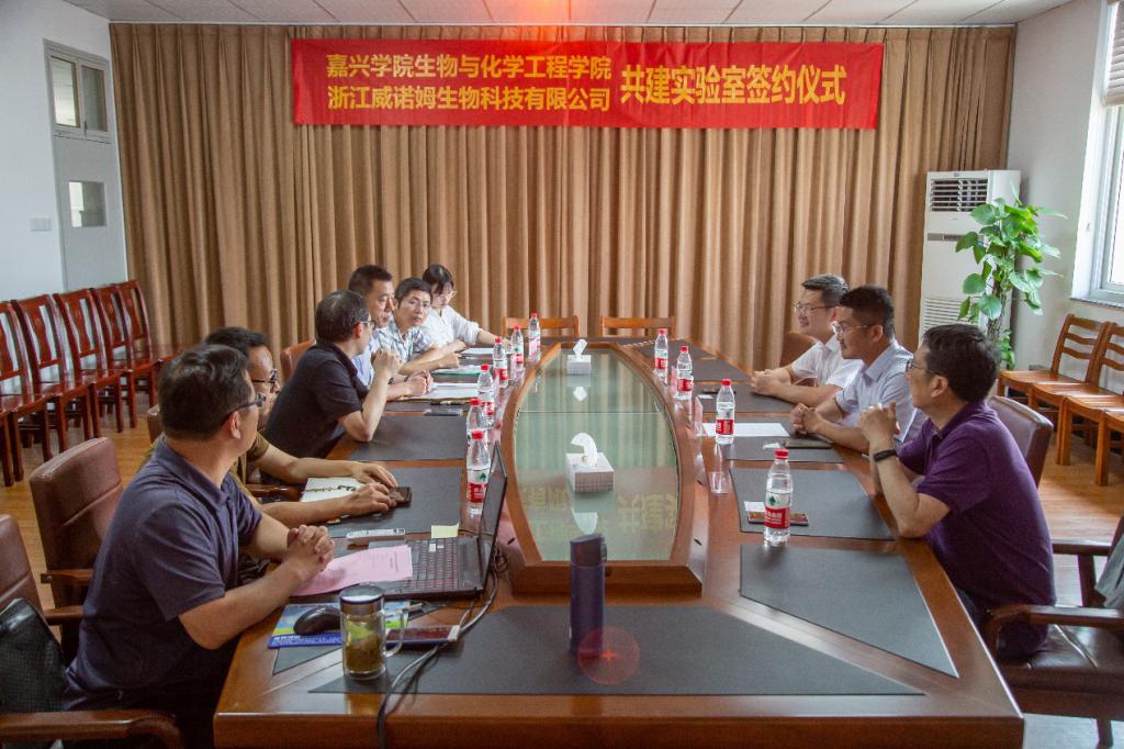为了深化产教融合,加强校企合作,生化学院于6月12日下午,在梁林校区1号楼516会议室与浙江威诺姆生物科技有限公司举行共建实验室签约仪式。院长周宏伟、副院长张瑾,浙江威诺姆生物科技有限公司执行董事兼总经理朱冯光、副总经理陆钰铭,嘉兴市平湖曹桥街道副主任寿钢军出席仪式,实验中心副主任徐松、环生系副主任朱长俊、系务委员尤忠毓及骨干教师黎梦博士参加仪式。仪式由环生系副主任朱长俊主持。