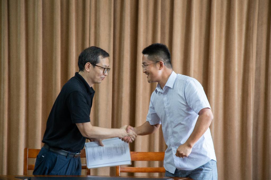 随后,周宏伟院长与朱冯光总经理签署了共建协议。周宏伟院长致辞,此次合作协议的签订标志着双方在资源共享、优势互补方面迈出了关键的一步,并表示学院将以此次签约为契机,进一步增进双方的交流与合作,加大产教融合深度,全力做好实验室共建、管理和生物医药制品研发等工作,争取在科技创新、人才培养及社会服务等方面取得更多高质量成果,实现合作双赢,共同发展。