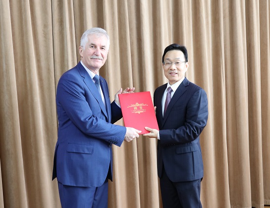 校长卢新波向Vladimir Potkin院士颁发特聘教授聘书