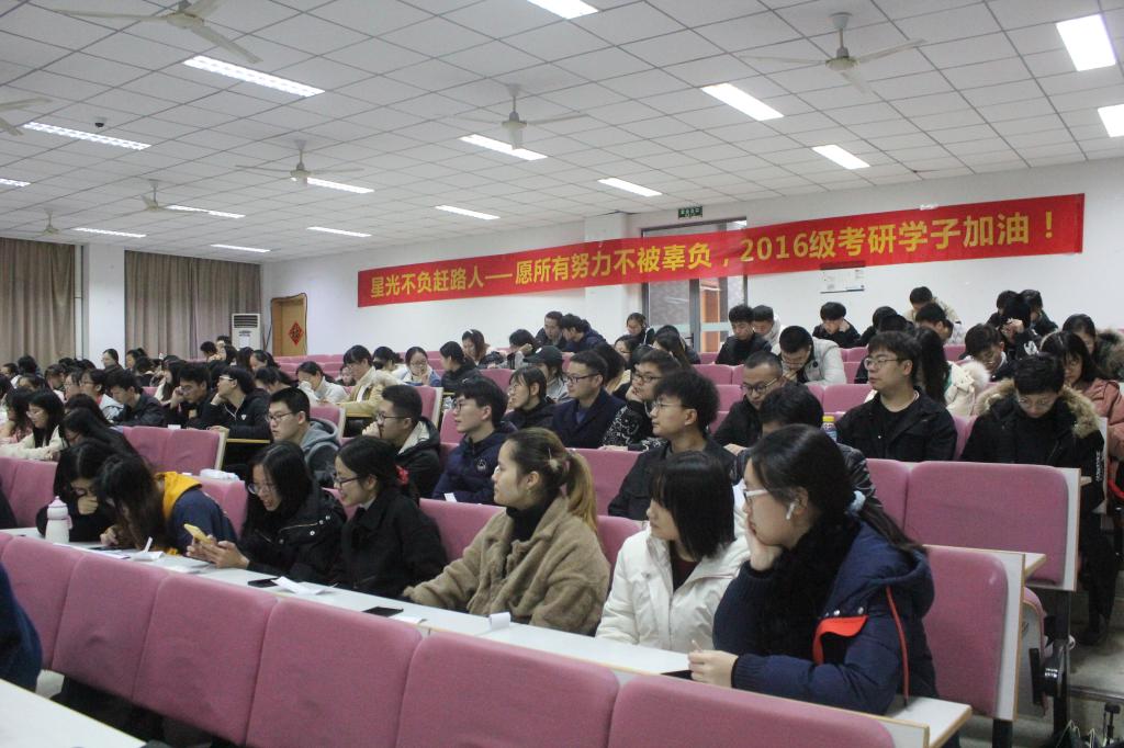 为鼓舞考研学子备考士气,11月27日,生化学院在7号楼报告厅召开了考研慰问暨考前动员大会,参加会议的有生化学院院长周宏伟、生化学院党委副书记蔡运男,2016级考研班主任朱长俊、学工办老师以及全体2016级考研学子。