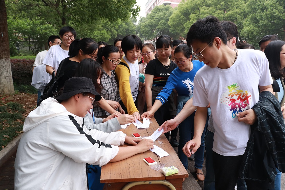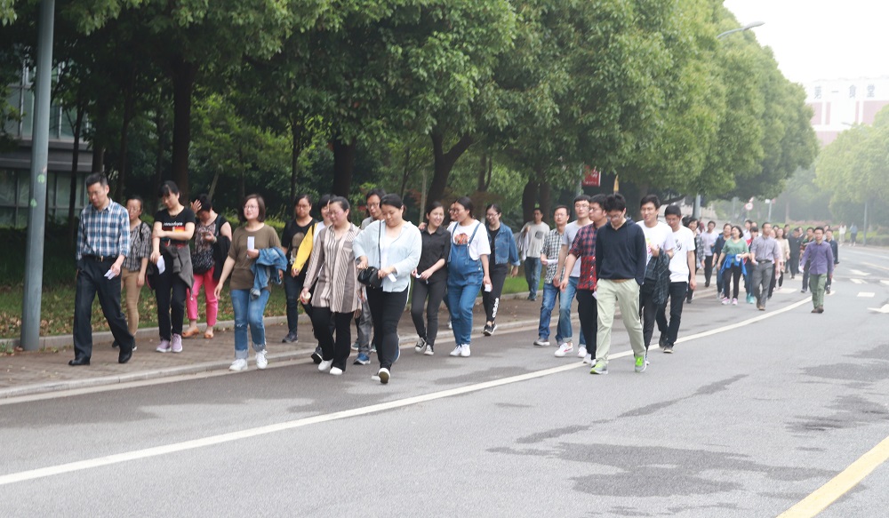 学院教职工在梁林校区田径操场看台下起点集合后,按照健身走路线环梁林校区绕一圈,行程中间设置了三个打卡点(第一食堂门口、学生活动中心、TCL报告厅),教师们打卡后继续行走,最后在终点处梁林校区田径操场看台下签到。