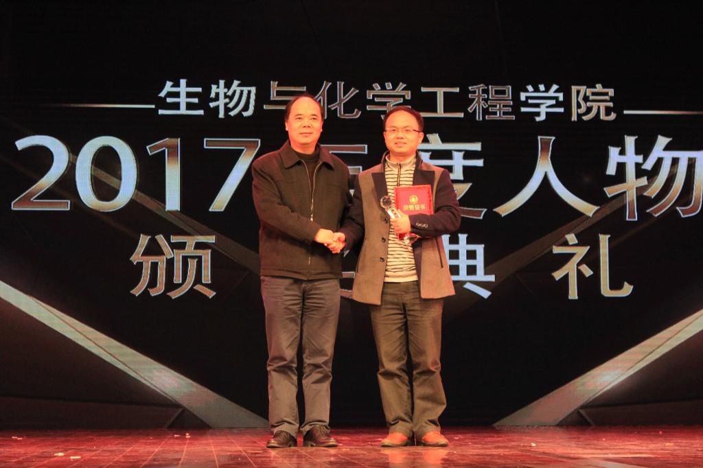 首先进行的是2017年生化学院年度人物颁奖典礼,典礼由曹红老师、胡万鹏老师主持。刘小明院长宣读了2017年生化学院年度人物获奖名单,并对每一位为学院辛勤付出的老师们表示了感谢。随后由张文华书记、方苏华书记、刘小明院长、蔡运男副书记为2017年度人物钟伟、吕春欣、邱观音生、陈晶晶、宗乾收、刘立春、李以名等7位老师颁奖。