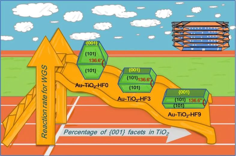 在多相催化中,载体效应总是引起广泛的关注。相同的载体在不同的催化反应中可能表现出不同甚至相反的催化效果。因此,我们可控合成不同{001}比例的TiO2,通过XRDRaman等表征技术,定量分析了TiO2 {001}暴露百分比对Au-TiO2催化剂水气变换(WGS)反应催化性能的影响。研究发现,随着合成过程中HF含量的增加,TiO2暴露的{001}比例逐渐增加,其对应催化剂的催化活性逐渐降低。测试循环稳定性发现,催化剂的循环稳定性受到Au颗粒大小和载体暴露{001}比例的共同影响。此外,将反应前后催化剂的WGS活性与{001}的百分比、氧化金的百分比相关联,发现均具有良好的线性相关性。这为定量分析晶面效应对催化活性的影响提供了很好的帮助。
