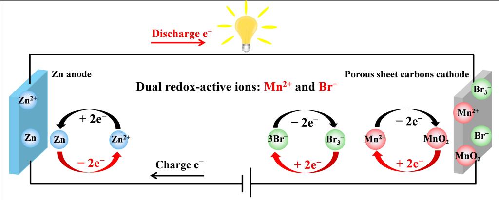 水系锌离子混合超级电容器是有竞争力、环保和安全的储能器件,但由于其比容量低,无法满足实际应用的需求。李溪教授团队通过在电解液中加入双氧化还原活性离子(Mn2+Br),其比容量是未添加氧化还原活性离子器件的2.66倍,达到1.25 mAh/cm2 (312.2 mAh/g)。机理如下:Mn2+被氧化为MnO2,沉积在正极多孔碳材料表面,Br被氧化为Br2,同时与Br结合形成Br3,吸附在正极多孔碳材料孔道内,放电时发生相反的反应。得益于Mn2+ Br贡献的容量,器件的比容量得到显著的提高。该研究工作对新型水系锌离子储能器件的结构设计提供了新思路。