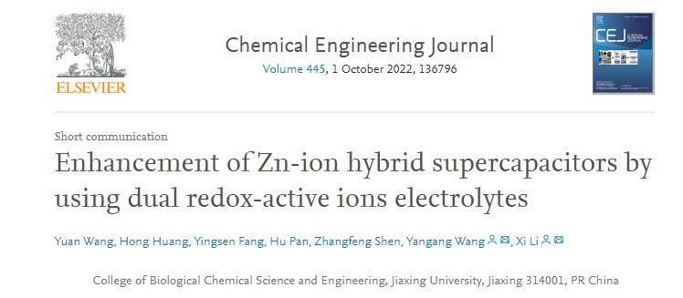 Yuan Wang, Hong Huang, Yingsen Fang, Hu Pan, Zhangfeng Shen, Yangang Wang* and Xi Li*Enhancement of Zn-ion hybrid supercapacitors by using dual redox-active ions electrolytes, 2022, 445, 136796.