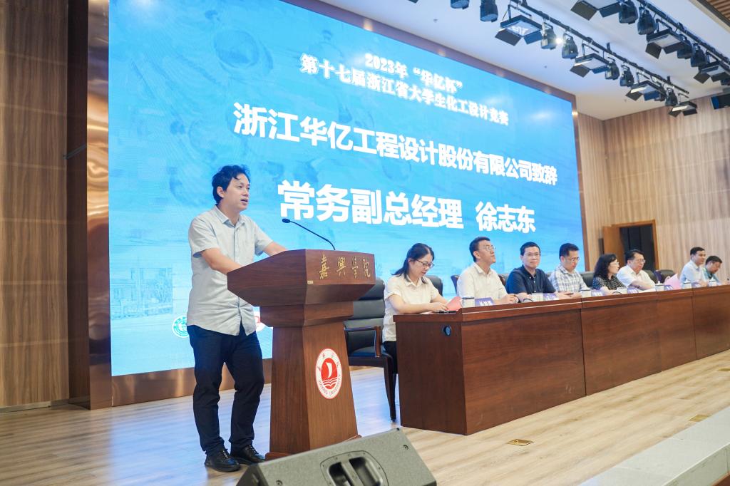 王靖岱、沈文华教授依次致辞。化工设计竞赛自2007年办赛以来,已发展成为最具规模、影响最广的化工类大学本科专业性赛事,该项竞赛全方位地锻炼了同学们的化工专业素养,培养了工程实践和综合应用能力,提高本科化学化工教育水平与人才培养质量,为化工行业培养创新人才,同时对化工专业教师的专业素养水平提升也起到了推动作用。浙江华亿工程设计有限公司常务副总经理徐志东先生代表赞助单位进行发言,鼓励同学们为解决化工行业“卡脖子”问题上不懈努力、勇攀高峰,希望通过赞助竞赛,为优秀化工人才培养贡献一份力量。