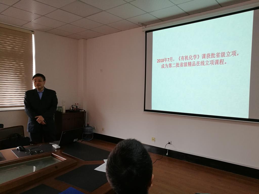 生化学院有机化学课程组组长杨义文老师以《有机化学》课程为例,主要从申报书的撰写、慕课的拍摄、网站的维护与使用等方面交流了自己在精品在线开放课程申报与建设方面的经验。随后生化学院的优秀青年教师代表邱观音生老师以自己的亲身经历做了一个题为“青年教师如何处理好教学和科研的关系”的简短发言。