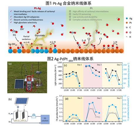 银(Ag)是室温下导电性最高的金属,适合作为电催化剂的辅助金属。然而,银在电氧化反应中并无催化活性,且较易氧化(0.7996 V vs. RHE),因此多数研究人员忽略了其在电催化氧化反应中的作用。在18AV 曹雪波研究团队的指导下,马佳敏等本科生携手杨颖等研究生开展研究,他们发现,Ag原子作为辅助金属,不仅通过传统配体效应优化催化中心Pt/Pd的电子结构,进而促进乙二醇的催化氧化,还借助原位电化学光谱学技术与理论计算揭示了Ag原子的另一重要作用:加速催化剂活化水分子,并产生羟基自由基(*OH),形成Ag-OH活性物种。Ag-OH活性物种能以一种更优的、非竞争性的Langmuir–Hinshelwood机制加速醇脱质子(1),并快速释放氧化的碳基中间体,从而高选择性、高通量地得到目标产物乙醇酸与氢气,并能有效防止催化剂毒化,相关成果发表于中科院一区期刊上(Journal of Colloid and Interface Science 2025684197–206)。该研究小组还发现,在Ag-PdPtskin纳米线催化的乙二醇电氧化耦合制氢体系中,在>1.2 V电位下,会形成Ag2+Ag活性物种能以非法拉第的模式直接氧化乙二醇与某些有毒中间体,从而提高催化剂的活性与抗中毒能力。在以粗乙二醇为原料的无膜电解制氢体系中,表现出超过3000小时的稳定性与工业级电流密度(>400 mA/cm2)(2),相关成果发表于中科院一区期刊上(Advanced Functional Materials. 2024, 2418588)。以上研究受到国创项目(《银纳米线选择性电氧化醇耦合制氢》,马佳敏等人,指导老师黄林/曹雪波)、国家自然科学基金(no.2227507422102063)与企业横向等课题的资助。