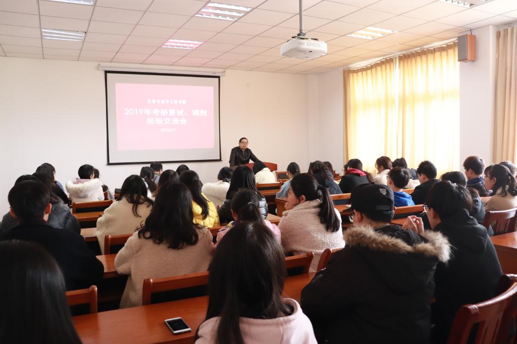 3月7日下午15:20,18AV 在1号楼506教室举行了2019年考研复试、调剂经验交流会,此次会议邀请了生化学院院长周宏伟、考研班班主任朱长俊来做复试、调剂指导。